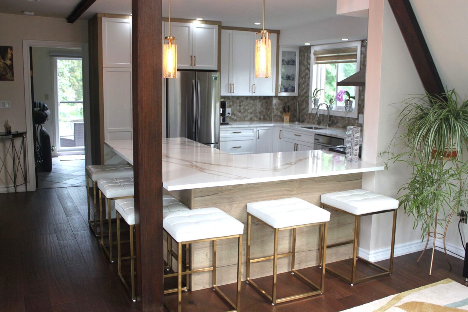Similar to an island kitchen, but the island is connected to the main workspace, providing extra surface area and seating.