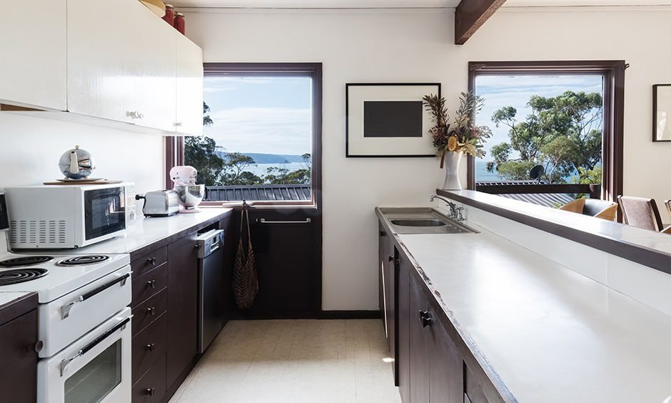 A simple, space-efficient layout where everything is aligned on a single wall, ideal for small spaces or open layouts.